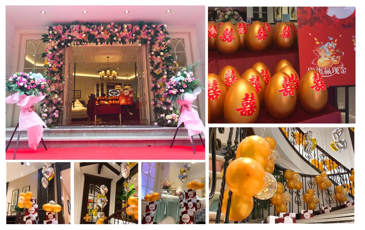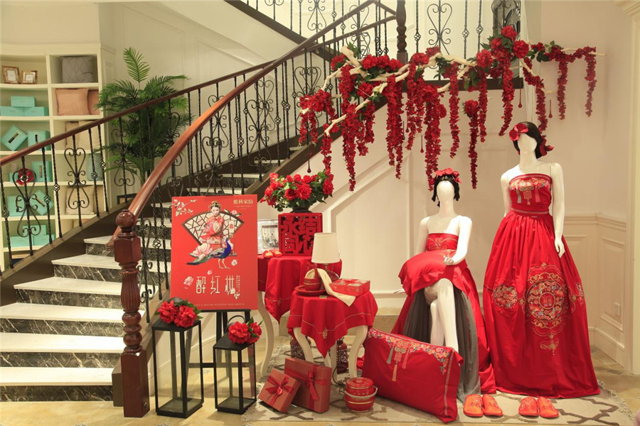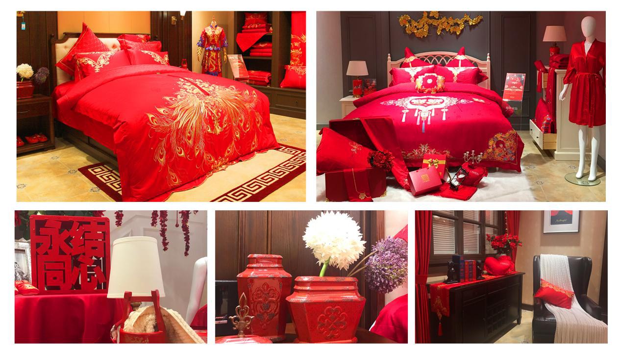 為帶給顧客更直觀舒適的消費體驗,在空間設(shè)計上,維科家紡和義店二樓婚慶家紡場景展示區(qū)摒棄了家紡行業(yè)傳統(tǒng)高柜+展床的方式,將300余平的空間分隔成7個實景樣板間,真實體現(xiàn)婚慶床品在日常家居生活中的效果,也能滿足顧客在選購婚慶床品的同時,一站式解決對婆婆禮、長輩禮以及婚慶小件(子孫桶、火銃、虎頭鞋等)的需求。由于該創(chuàng)意目前在家紡行業(yè)中應(yīng)用較少,可借鑒之處寥寥無幾,公司各部門投入了大量的時間精力不斷對方案進行修改,力求盡善盡美。整個二樓還設(shè)置了一大一小兩個洽談區(qū),都配備了舒適的沙發(fā)以及精致的茶歇,以供顧客能夠坐下來向?qū)з徳敿毩私獯财返男畔?。在陳列布置上,?dāng)季新品醉紅妝、子孫滿堂、胭脂醉,熱銷品百子納福、麒麟賀滿堂等都被直接鋪設(shè)于房間內(nèi),并搭配生活化的情景道具,供顧客選購。