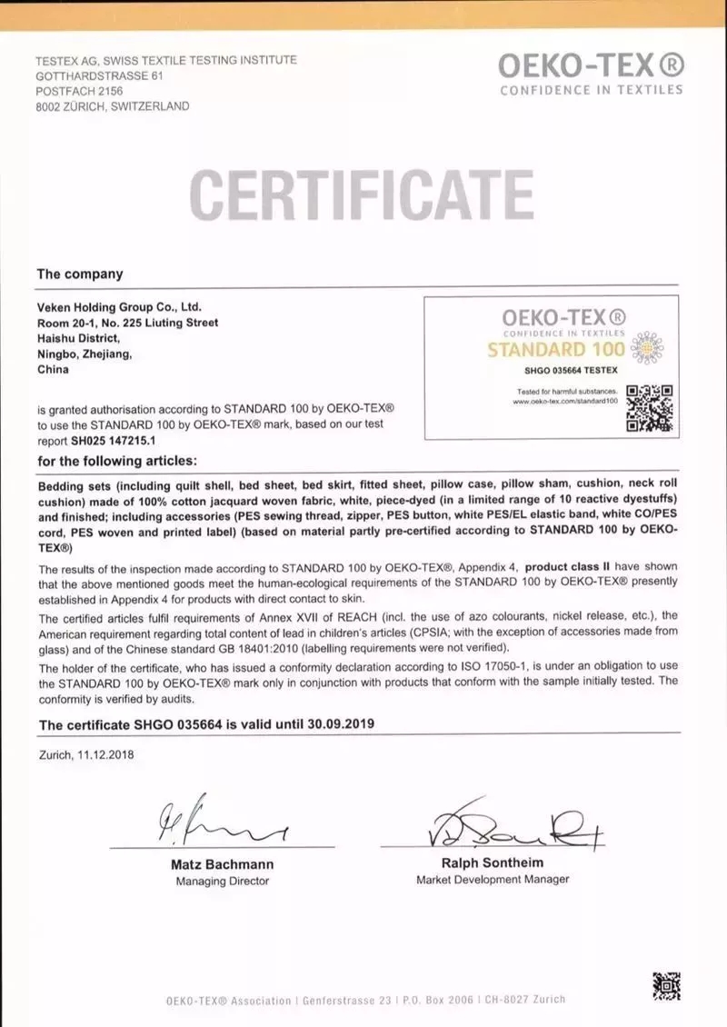 該證書標(biāo)簽適用產(chǎn)品為:床上用品(被套、床單、床圍、靠墊套、護(hù)頸套)由白色、經(jīng)匹染(染料的適用范圍僅限于已申報的10支活性染料)和后整理的全棉提花梭織面料制成;輔料包括(滌綸縫紉線、拉鏈、滌綸紐扣、白色滌綸/氨綸松緊帶、白色滌棉抽繩、滌綸織標(biāo)和印標(biāo))(部分使用有STANDARD 100 by OEKO-TEX證書的原材料)。
