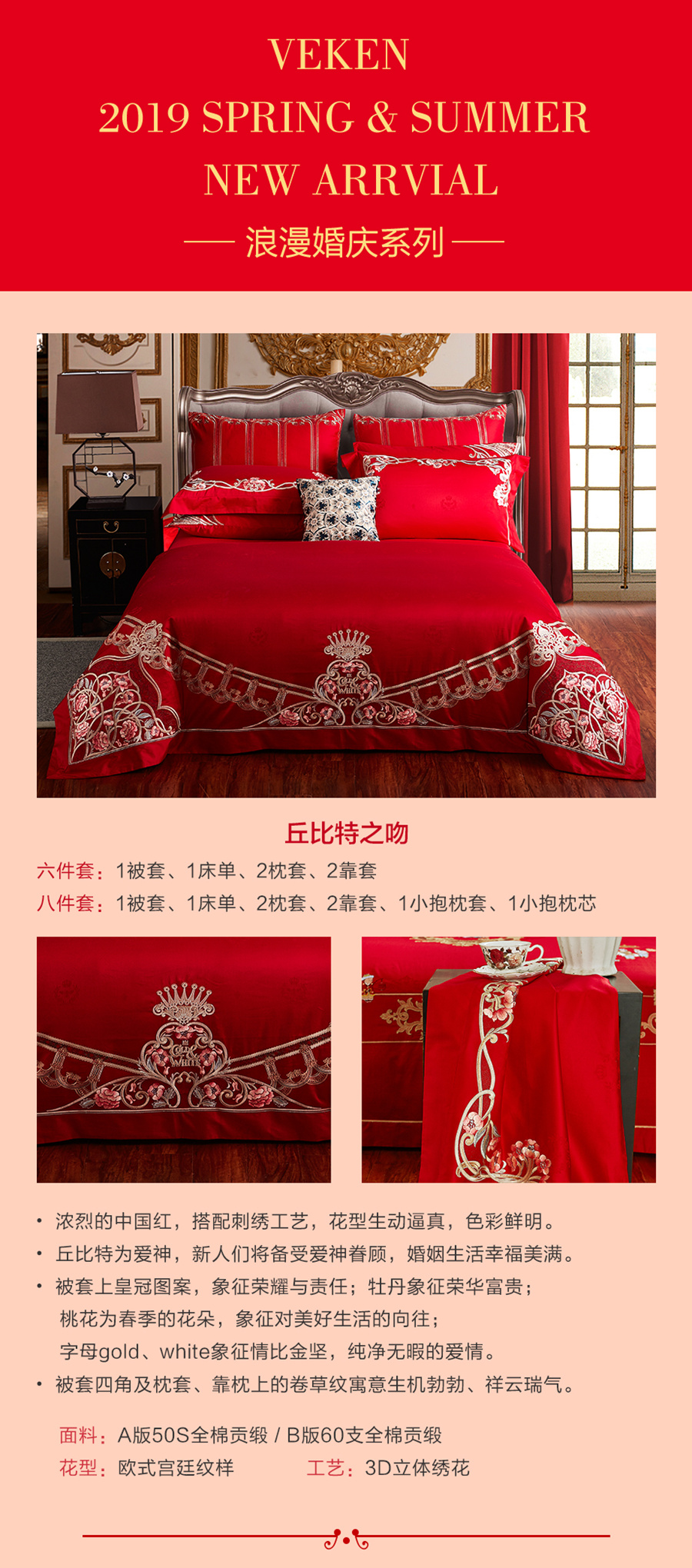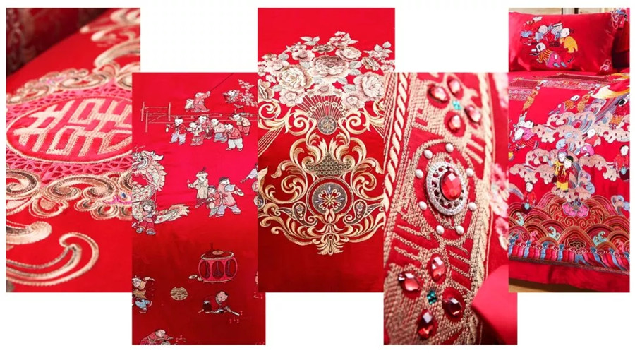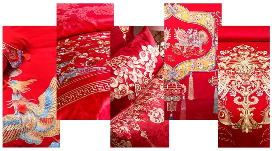 中國紅是中國人結(jié)婚必須的顏色,結(jié)婚當(dāng)天一定需要鋪一套紅色的床品,即鎮(zhèn)宅也象征新人從此紅紅火火幸福美滿。