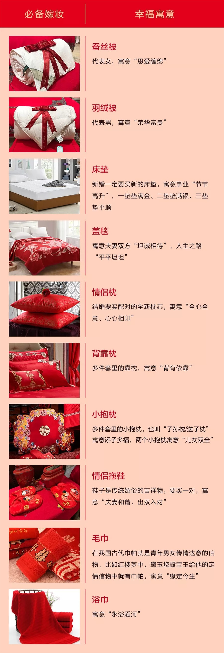 寓意“八穩(wěn)”的八鋪八蓋,承載了父母對新人濃濃的愛,同時也是對子女未來五谷豐登、榮華富貴的美好祝愿。