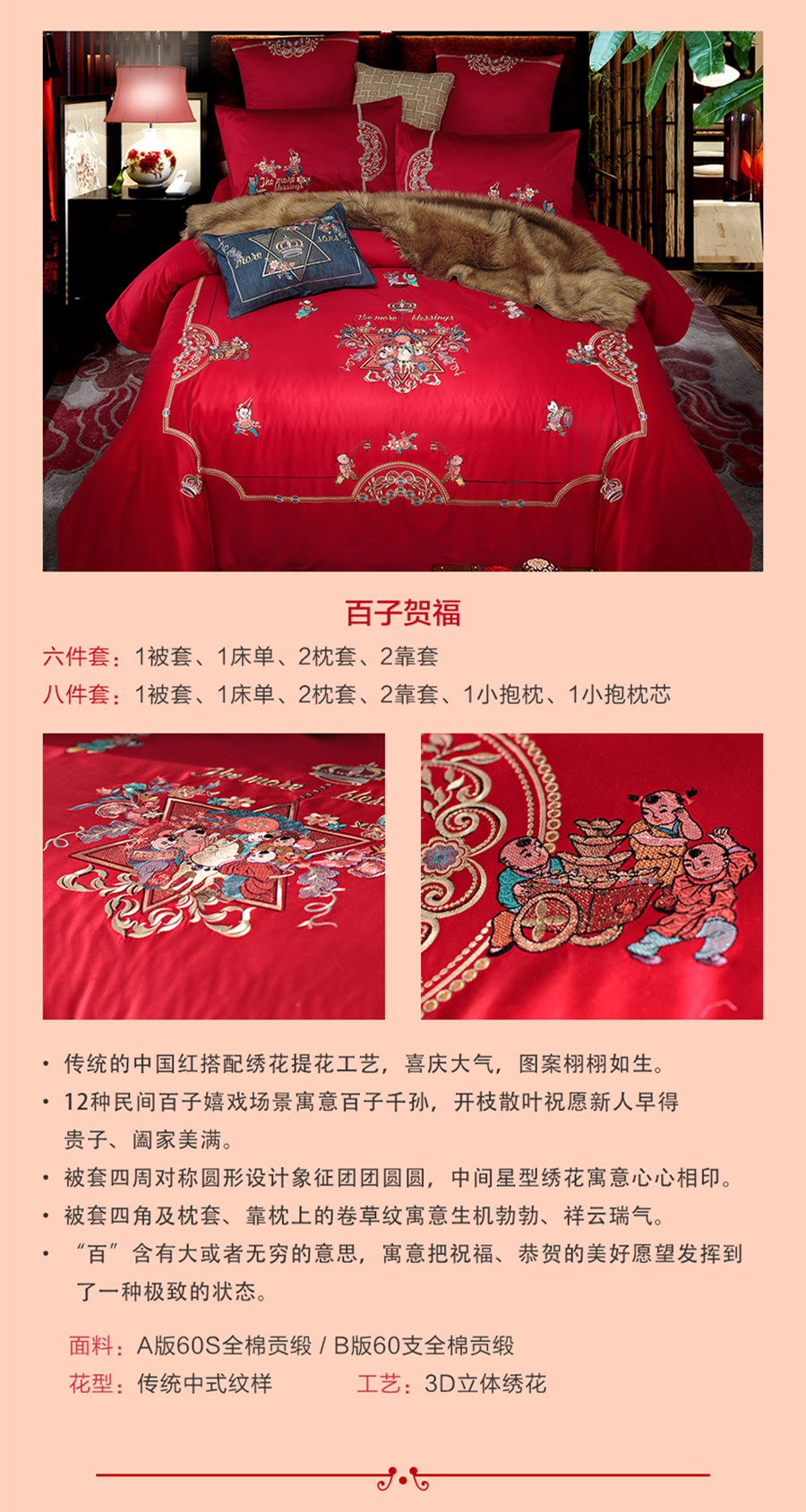 婚慶套件一定要有吉祥圖案,如龍鳳呈祥、百年好合、五子登科、雙喜臨門等,一來這樣的圖案大氣,二來美好的寓意可以為新人帶來福喜。比如一些套件會在表面繡有紅棗、花生、桂圓、蓮子,象征著早生貴子。
